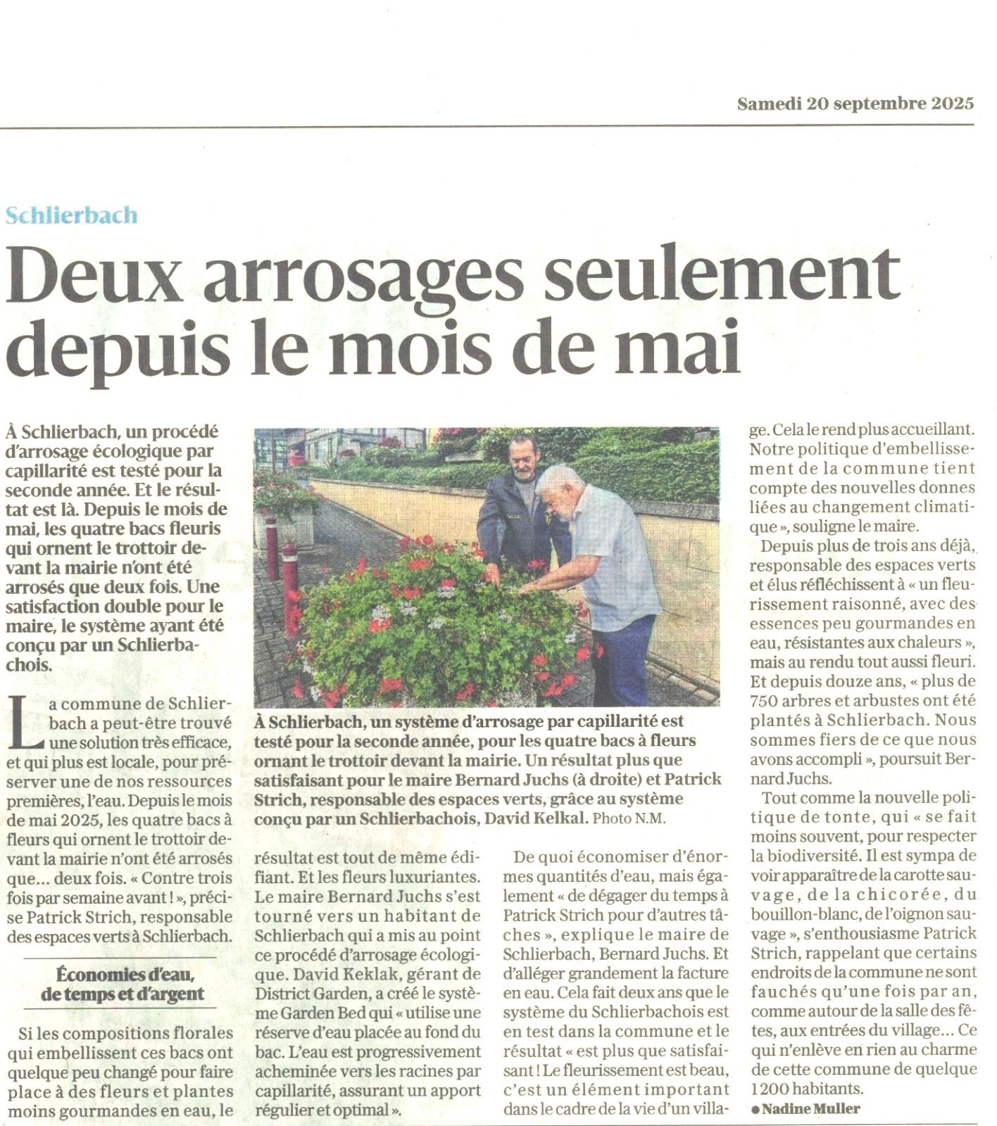 À Schlierbach, un système d’arrosage écologique par capillarité permet depuis deux ans d’entretenir les massifs fleuris avec très peu d’eau. L’article de L’Alsace du 20 septembre 2025 présente cette initiative locale exemplaire face aux enjeux climatiques.